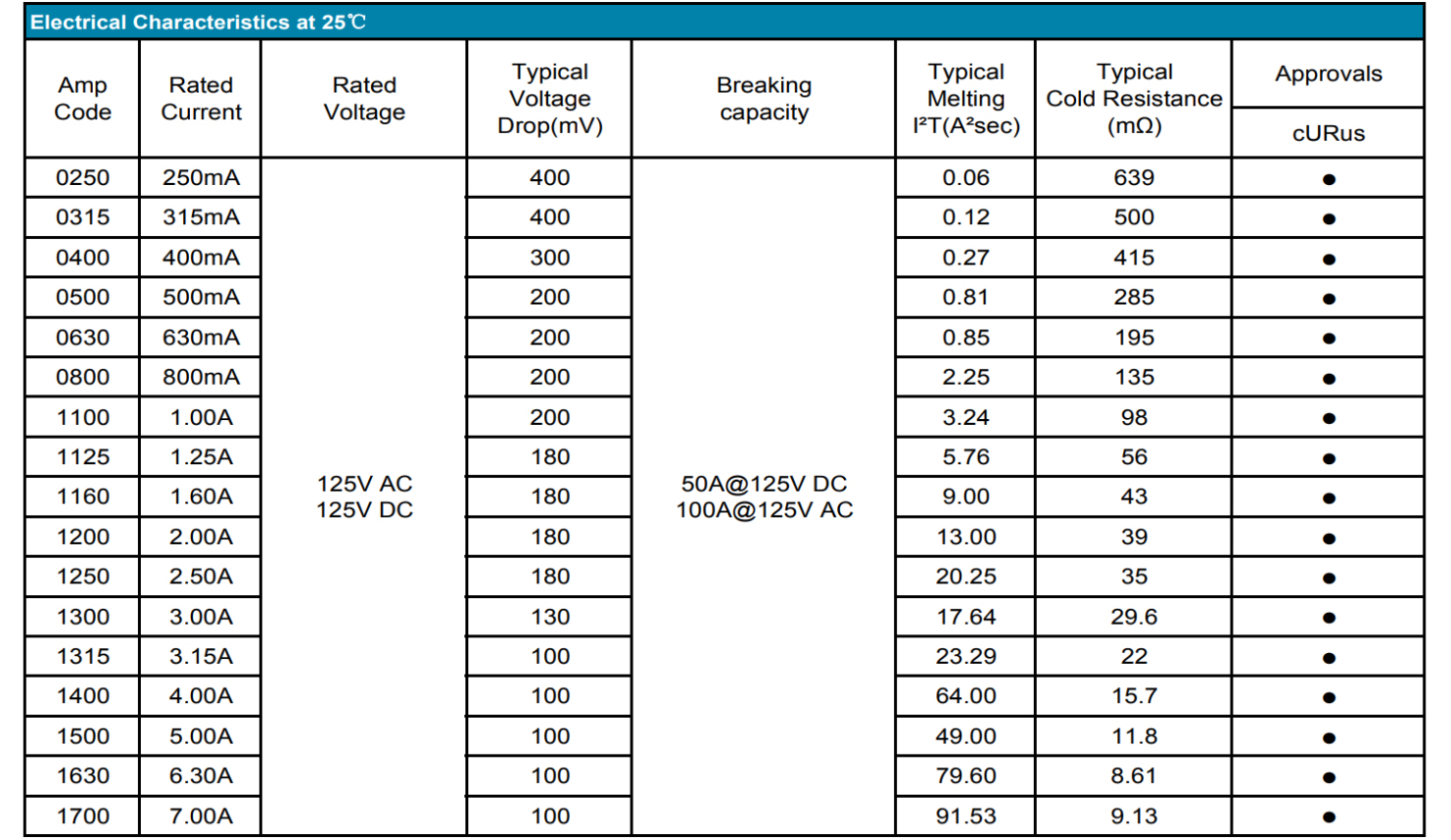 额定电流:250mA~7A